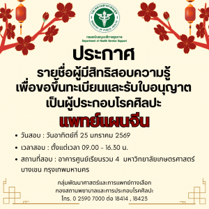 กองสถานพยาบาลและการประกอบโรคศิลปะ โดยกลุ่มพัฒนาศาสตร์และการแพทย์ทางเลือก ขอแจ้งให้ผู้สอบผ่านและมีสิทธิได้รับหนังสืออนุญาตให้ทำการประกอบโรคศิลปะโดยอาศั...