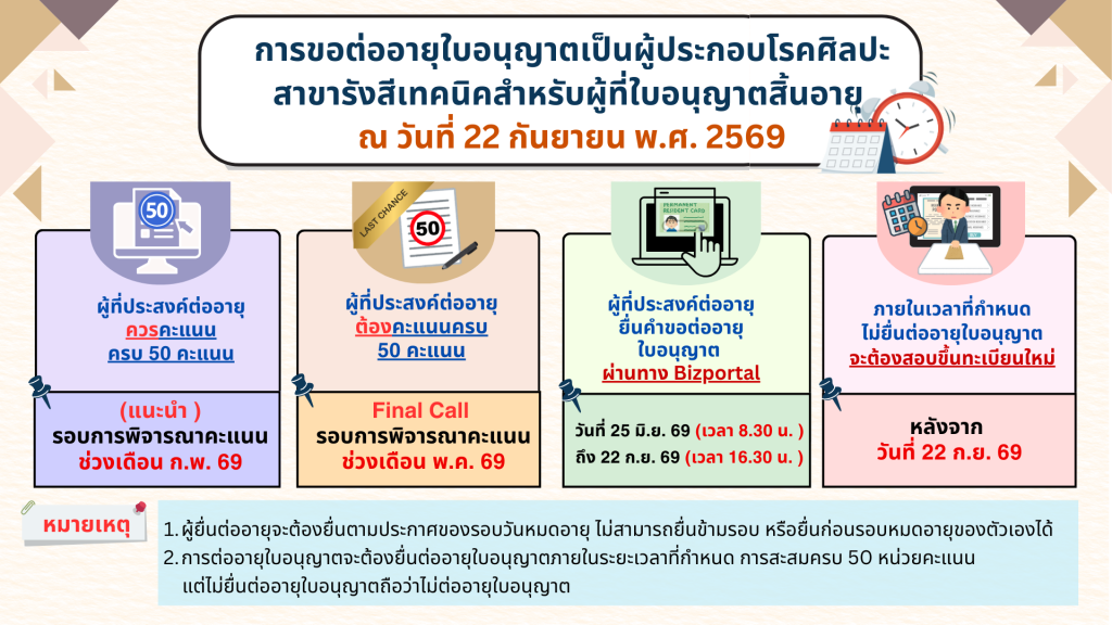 ผู้ประกอบโรคศิลปะสาขารังสีเทคนิคที่ใบอนุญาตจะสิ้นอายุ ณ วันที่ 22 กันยายน พ.ศ. 2569 เลขที่ใบอนุญาต ร.ส.5279 – 5675 ให้ยื่นคำขอต่ออายุใบอนุญาตได้ตั้งแต่วันที่ 25 มิถุนายน ถึงวันที่ 22 กันยายน 2569 โดยผู้ที่ยื่นขอต่ออายุใบอนุญาตจะต้องเก็บคะแนนการศึกษาต่อเนื่องได้ครบ 50 หน่วยคะแนน จึงจะสามารถยื่นคำขอได้ ทั้งนี้ สามารถตรวจสอบผลการเก็บคะแนนการศึกษาต่อเนื่องได้ที่ คลิกที่นี่