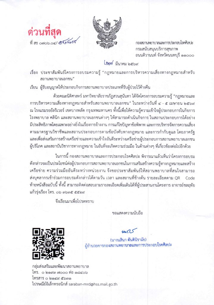 คลิ้กเพื่อดุ ประชาสัมพันธ์โครงการอบรมความรู้ กฎหมายและการบริหารความเสี่ยงทางกฎหมายสำหรับสถานพยาบาลเอกชน